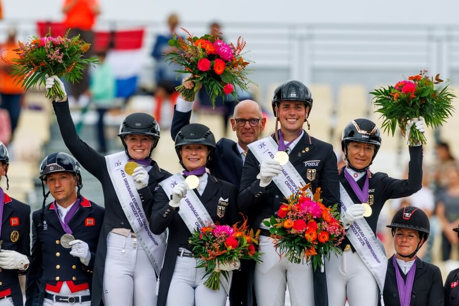 Die deutsche Dressur-Equipe mit den OSP-Reiter*innen Katharina Hemmer, Isabell Werth, Frederic Wandres und Ingrid Klimke konnte sich bei der Europameisterschaft im französischen Crozet die Goldmedaille sichern. Nach einer durchwachsenen Leistung am Starttag durch Auftaktreiterin Ingrid Klimke, zweimalige Olympiasiegerin in der Vielseitigkeit, der mit Vayron zu viele Fehler unterliefen (69,348 Prozentpunkte), ...